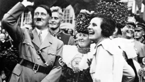 El cine como una herramienta de propaganda visual capaz de “hipnotizar” a las masas por medio de filmografías, cuya metodología y estructura ha sido estudiada y manipulada hasta el último detalle para tal fin, revolucionando todas las formas establecidas de la estética cinematográfica hasta el momento. La encargada de llevar a cabo semejante tarea no será otra que la cineasta de origen alemán Leni Riefenstahl quien se convertirá de alguna manera en los ojos del tercer Reich. Aprovechando todos los medios económicos y tecnológicos que el partido Nazi pone a su disposición realiza una serie de películas documentales que exaltan y enaltecen el poder de la raza Aria y la imagen del que será el nuevo Mesías (el nazismo tuvo mucho en común con la fe irracional de las religiones) de la nueva Nación europea: Adolf Hitler.